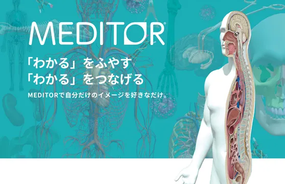 「MEDITOR」には、一般的な医学解剖アプリとは異なり、医学教育教材に寄り添って分類された3DCGモデルが150以上(Premiumプラン)搭載されており、2次元の図では難解であった解剖学的理解が大幅に向上します。さらに、デバイス上で3DCGモデルを自由自在に動かし簡単に加工を施し、作った画像をそのままダウンロードできるので、学習ノートまとめや教材作り、グラフィックデザインの素材作成としても活用できます。